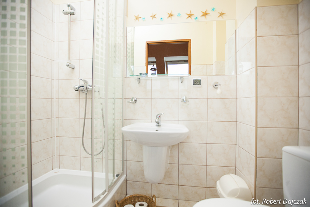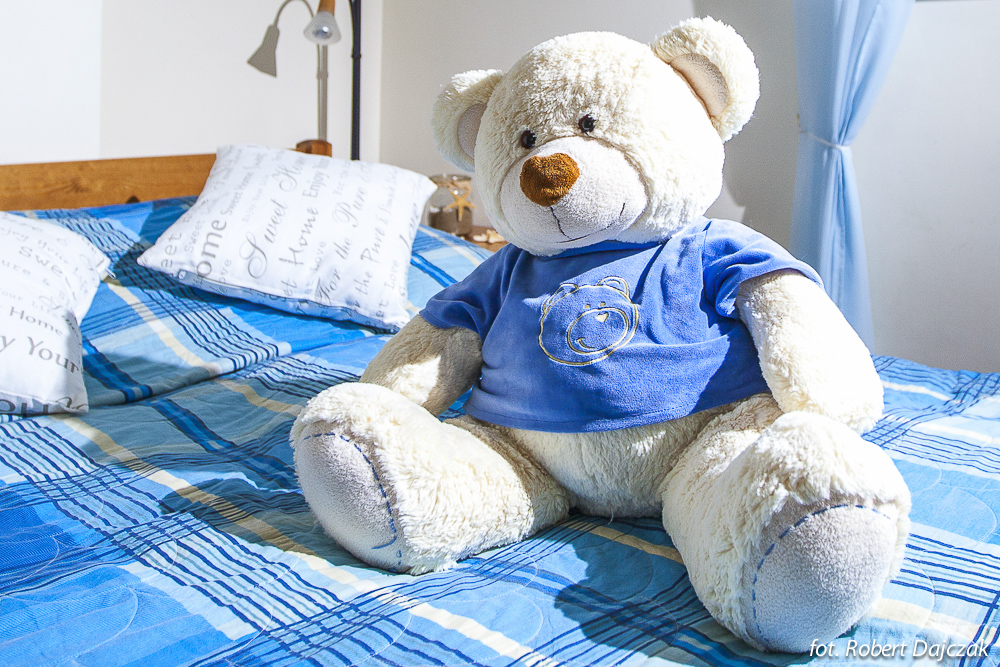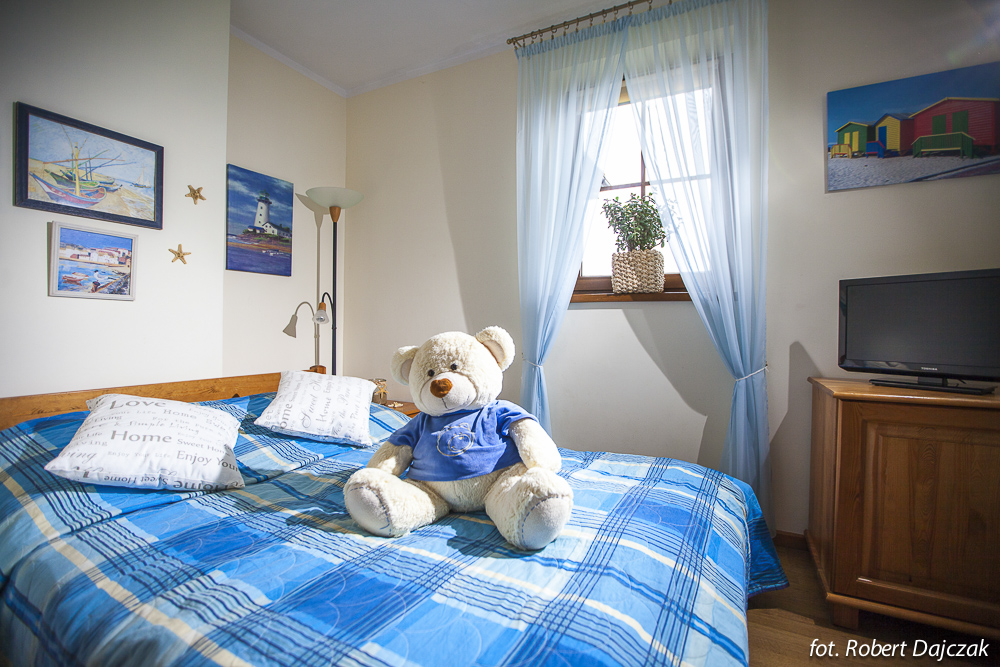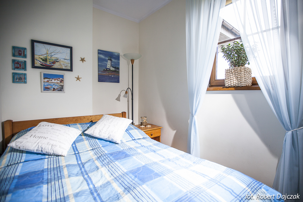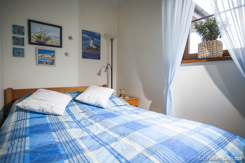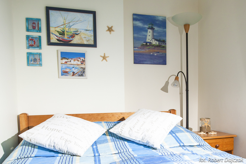 Osobom poszukującym pokój w Rewalu proponujemy pokój "Morski" charakteryzujący się kolorystyką morską.